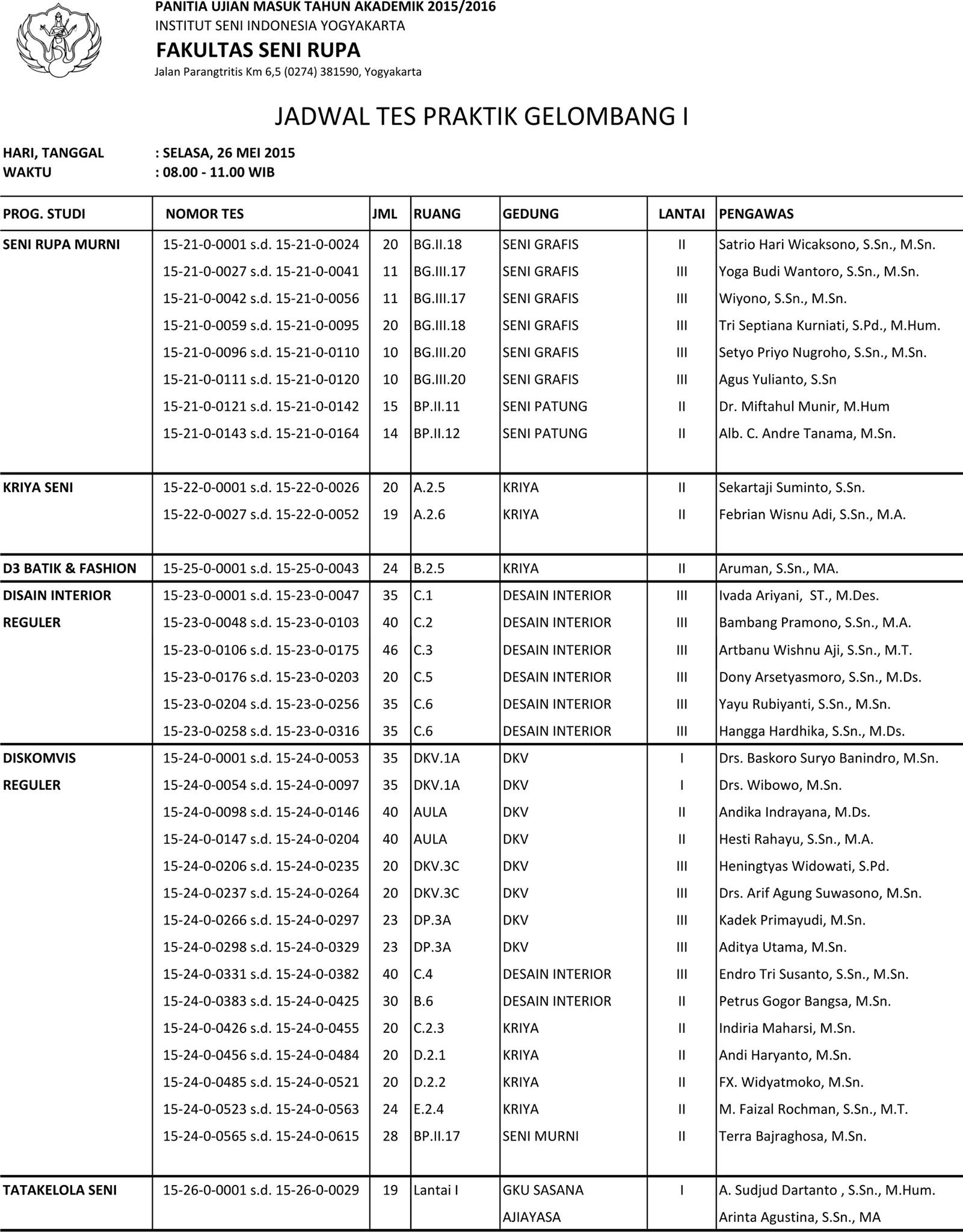 JADWAL TES PRAKTIK FSR ISI YOGYAKARTA GELOMBANG I PMB TA 2015/2016